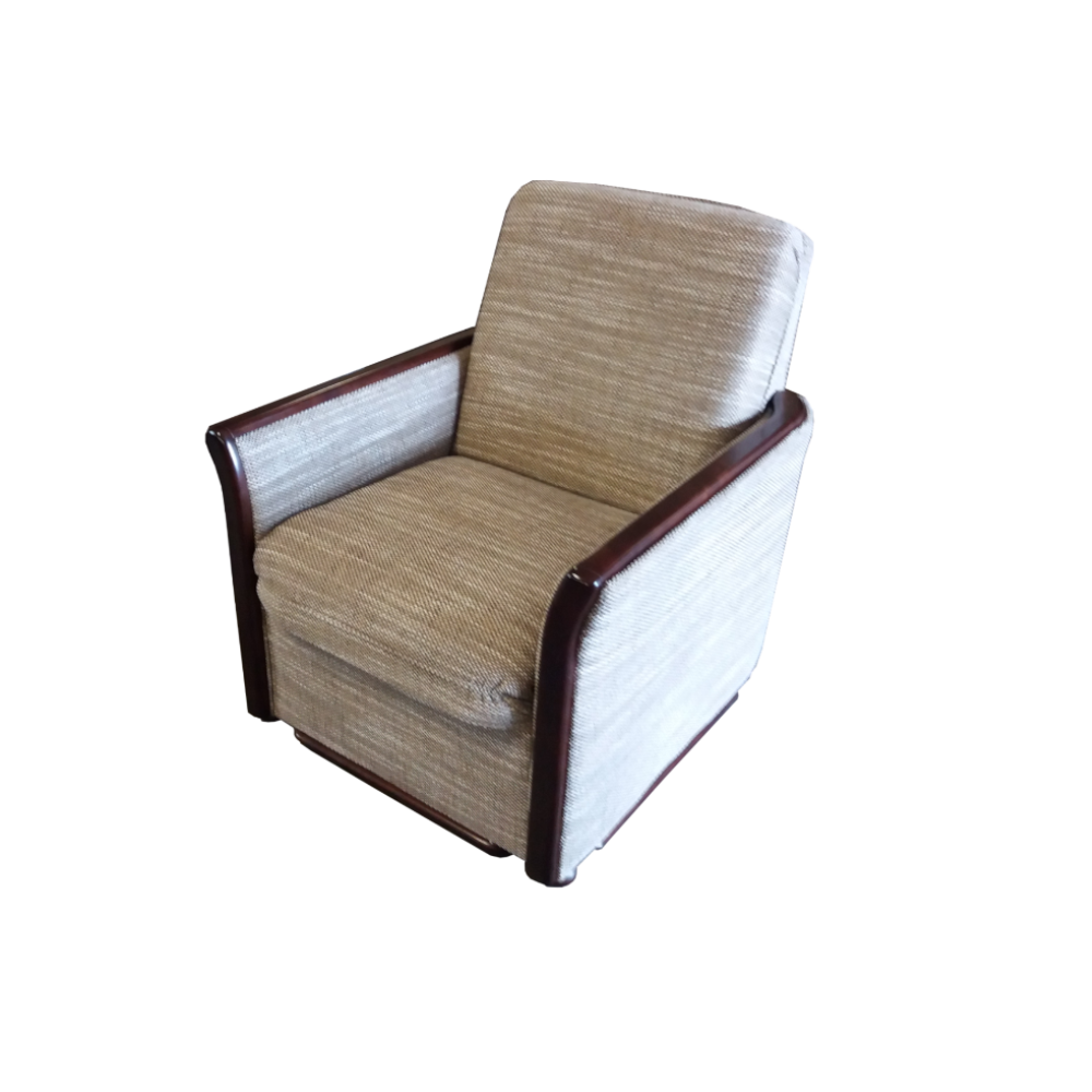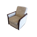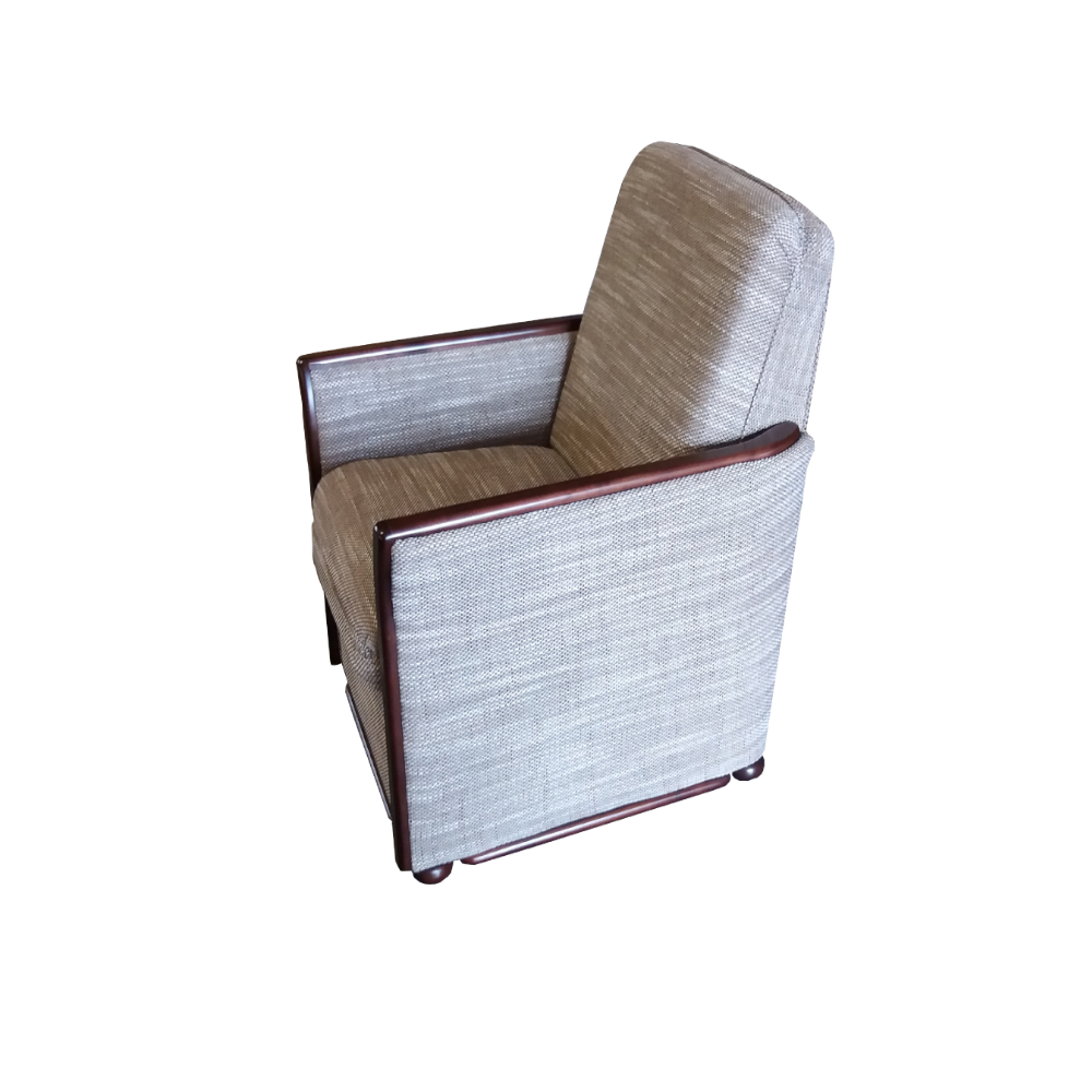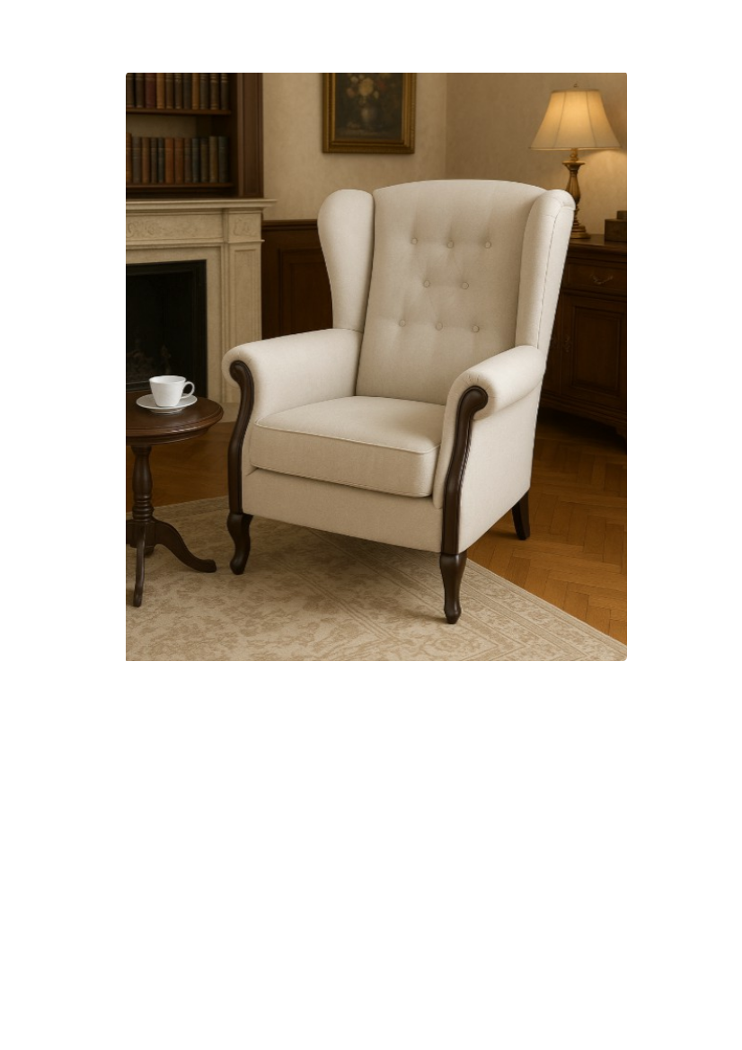Ten fotel to klasyczny „uszak”, który łączy elegancję z wygodą. Jego wysokie oparcie z charakterystycznymi bocznymi skrzydłami zapewnia komfort i doskonałe podparcie dla pleców. Jasna tapicerka nadaje mu lekkości i sprawia, że świetnie prezentuje się w każdym wnętrzu. Drewniane, stylizowane elementy dodają mu uroku i podkreślają tradycyjny charakter mebla. To idealny fotel do salonu lub biblioteki, w którym można zrelaksować się przy książce lub filiżance kawy.