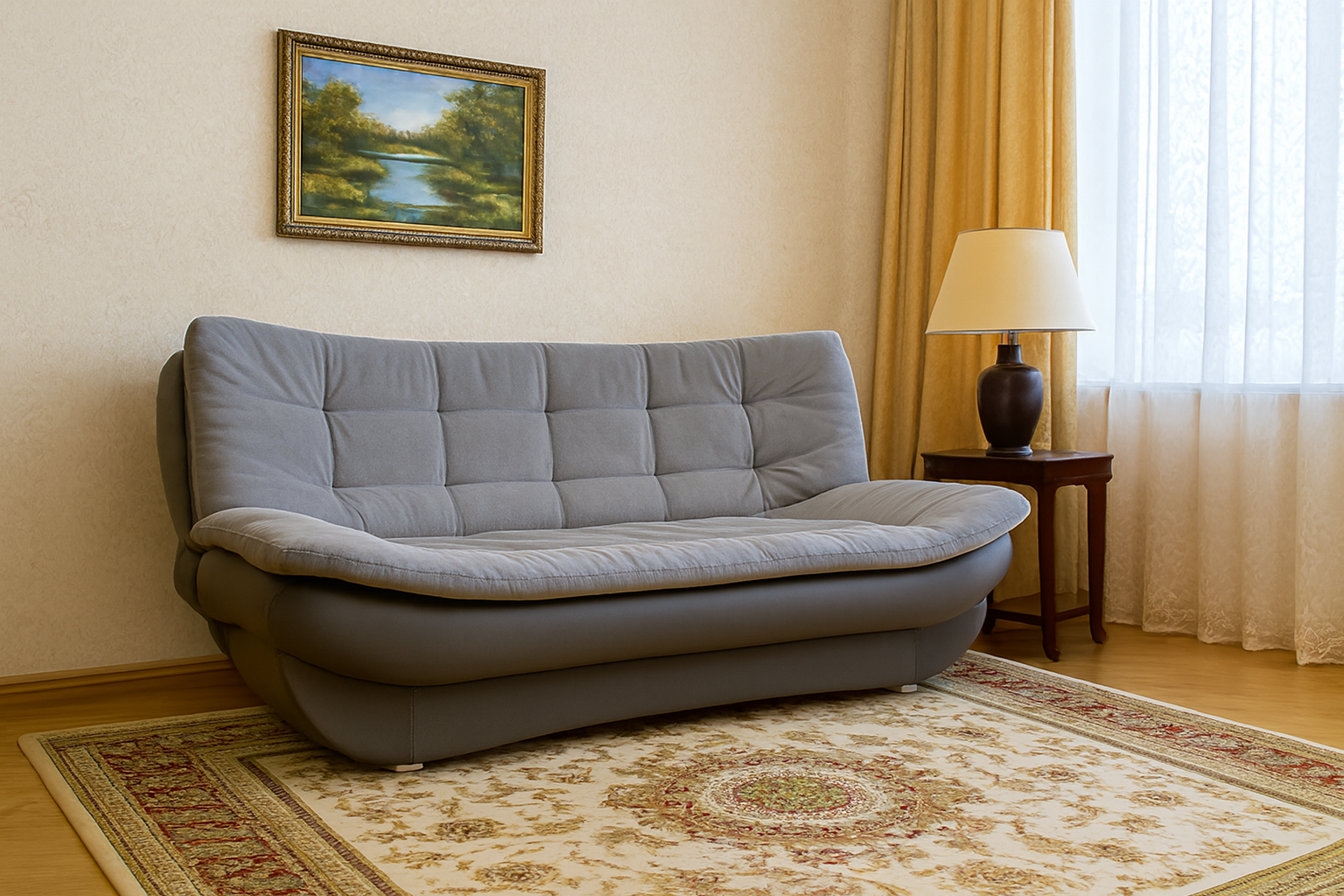 Ta wersalka wyróżnia się miękką, nowoczesną formą i wyraźnie pikowanym oparciem, które nadaje jej przytulny charakter. Jasne, stonowane obicie sprawia, że mebel łatwo dopasować do różnych aranżacji wnętrz, zarówno klasycznych, jak i nowoczesnych. Szerokie siedzisko oraz delikatnie zaokrąglona linia zapewniają wysoki komfort wypoczynku. To idealny wybór do salonu, w którym liczy się wygoda i spokojna, elegancka estetyka.